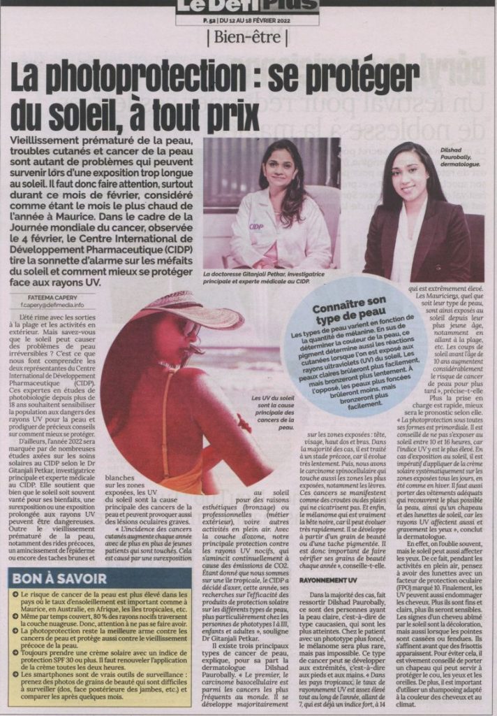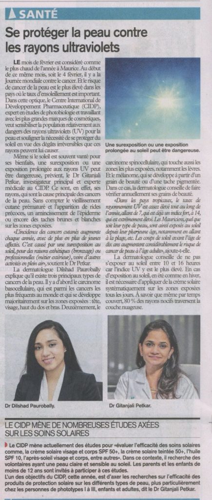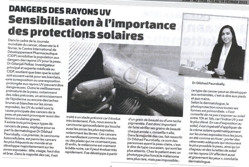 In this context, our dermatologists at CIDP Mauritius raised awareness on the ill effects of ultraviolet rays (UV) on the skin and emphasized the need to protect oneself from the sun in view of the irreversible damage that these rays can cause.