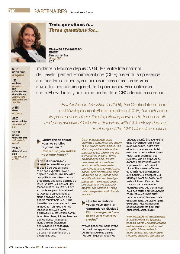 Our CEO, Dr Claire Blazy Jauzac, was honoured to answer these questions in an exclusive interview for Expression Cosmétique Magazine, issue No. 72.